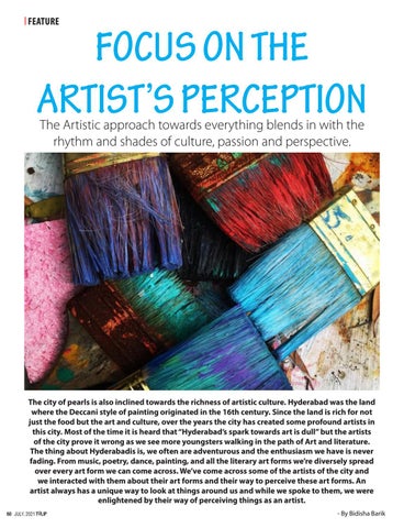The city of pearls is also inclined towards the richness of artistic culture. Hyderabad was the land where the Deccani style of painting originated in the 16th century. Since the land is rich for not just the food but the art and culture, over the years the city has created some profound artists in this city. Most of the time it is heard that “Hyderabad’s spark towards art is dull” but the artists of the city prove it wrong as we see more youngsters walking in the path of Art and literature. The thing about Hyderabadis is, we often are adventurous and the enthusiasm we have is never fading. From music, poetry, dance, painting, and all the literary art forms we’re diversely spread over every art form we can come across. We’ve come across some of the artists of the city and we interacted with them about their art forms and their way to perceive these art forms. An artist always has a unique way to look at things around us and while we spoke to them, we were enlightened by their way of perceiving things as an artist. 60 JULY, 2021 TULIP