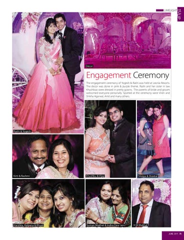 Engagement Ceremony The engagement ceremony of Yogesh & Rashi was held at Leonia Resorts. The decor was done in pink & purple theme. Rashi and her sister in law Khushboo were dressed in pretty gowns. The parents of bride and groom welcomed everyone personally. Spotted at the ceremony were Viren and Shikha Agarwal, Amit and many others.