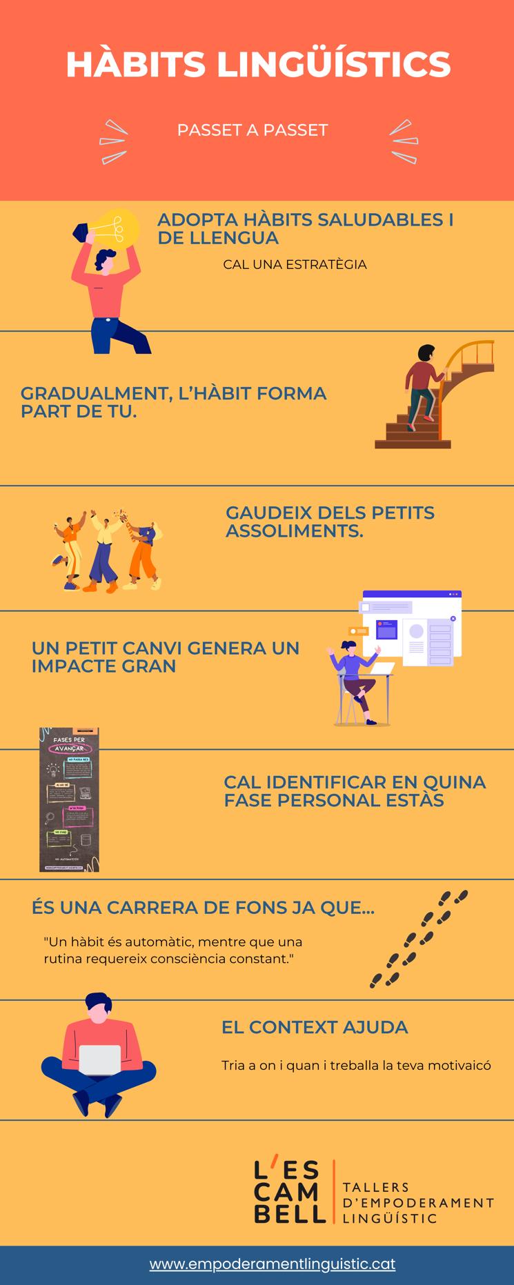 La paciència en el manteniment de bons hàbits: Si una persona intenta canviar un hàbit de manera abrupta (per exemple, volent començar a parlar cada dia català amb tothom des de l'inici), és probable que segons el context, el canvi no sigui sostenible per l’esforç psicològic que comportat (recordem que hi ha multitud de contextos al nostre territori i diversitat de vivències personals). Es pot començar en petits passos i reforçar-se per cada moment en què es parla el català en entorns complexos. A l’hora d’adoptar un nou hàbit, és important entendre que el canvi no és immediat i requereix temps. Aquest procés és gradual i implica reconèixer les diverses etapes en què ens trobem. Així com s’aplica a la salut o a l’aprenentatge de la llengua, la gestió del canvi es pot abordar en diverses passes. Al col·lectiu L'Escambell, es treballa precisament aquesta gestió del canvi, ajudant a identificar en quina fase ens trobem i a seguir els passos adequats per aconseguir una incorporació progressiva del català en la vida quotidiana. Des de la fase de conscienciació fins a la integració activa de la llengua, els tallers proporcionen l’entorn necessari per avançar de manera gradual i efectiva.