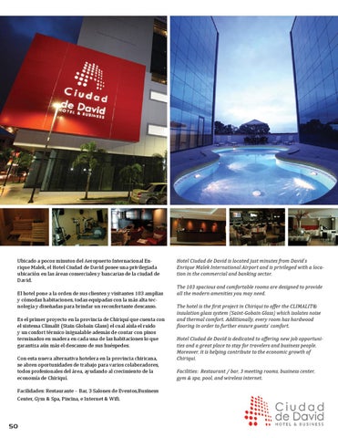 Es el primer proyecto en la provincia de Chiriquí que cuenta con el sistema Climalit (Stain Globain Glass) el cual aísla el ruido y un confort térmico inigualable además de contar con pisos terminados en madera en cada una de las habitaciones lo que garantiza aún más el descanso de sus huéspedes. Con esta nueva alternativa hotelera en la provincia chiricana, se abren oportunidades de trabajo para varios colaboradores, todos profesionales del área, ayudando al crecimiento de la economía de Chiriquí. Facilidades: Restaurante – Bar, 3 Salones de Eventos,Business Center, Gym & Spa, Piscina, e Internet & Wifi.