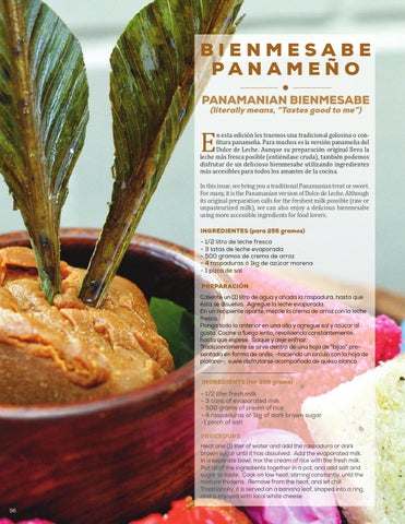 n esta edición les traemos una tradicional golosina o confitura panameña. Para muchos es la versión panameña del Dulce de Leche. Aunque su preparación original lleva la leche más fresca posible (entiéndase cruda), también podemos disfrutar de un delicioso bienmesabe utilizando ingredientes más accesibles para todos los amantes de la cocina. In this issue, we bring you a traditional Panamanian treat or sweet. For many, it is the Panamanian version of Dulce de Leche. Although its original preparation calls for the freshest milk possible (raw or unpasteurized milk), we can also enjoy a delicious bienmesabe using more accessible ingredients for food lovers. INGREDIENTES (para 255 gramos) - 1/2 litro de leche fresca - 3 latas de leche evaporada - 500 gramos de crema de arroz - 4 raspaduras ó 1kg de azúcar morena - 1 pizca de sal PREPARACIÓN Caliente un (1) litro de agua y añada la raspadura, hasta que ésta se disuelva. Agregue la leche evaporada. En un recipiente aparte, mezcle la crema de arroz con la leche fresca. Ponga todo lo anterior en una olla y agregue sal y azúcar al gusto. Cocine a fuego lento, revolviendo constantemente, hasta que espese. Saque y deje enfriar. Tradicionalmente se sirve dentro de una hoja de "bijao" presentada en forma de anillo, -haciendo un círculo con la hoja de plátano-; suele disfrutarse acompañado de queso blanco.
