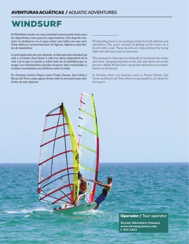 WINDSURF El WindSurf resulta ser una actividad emocionante tanto para los deportistas como para los espectadores. Este deporte consiste en deslizarse en el agua sobre una tabla con una vela. Estas tablas se caracterizan por ser ligeras, rápidas y muy fáciles de maniobrar. La principal meta de este deporte, es básicamente dominar las olas y el viento. Para llevar a cabo los saltos dependerá de la vela con la que se cuente y sobre todo de la habilidad que se tenga. Los windsurfistas pueden alcanzar altas velocidades y realizar movimientos acrobáticos sobre la tabla. En Panamá existen Playas como Punta Chame, Isla Colón y Bocas del Toro, cuyas aguas tienen todo lo necesario para disfrutar de este deporte.