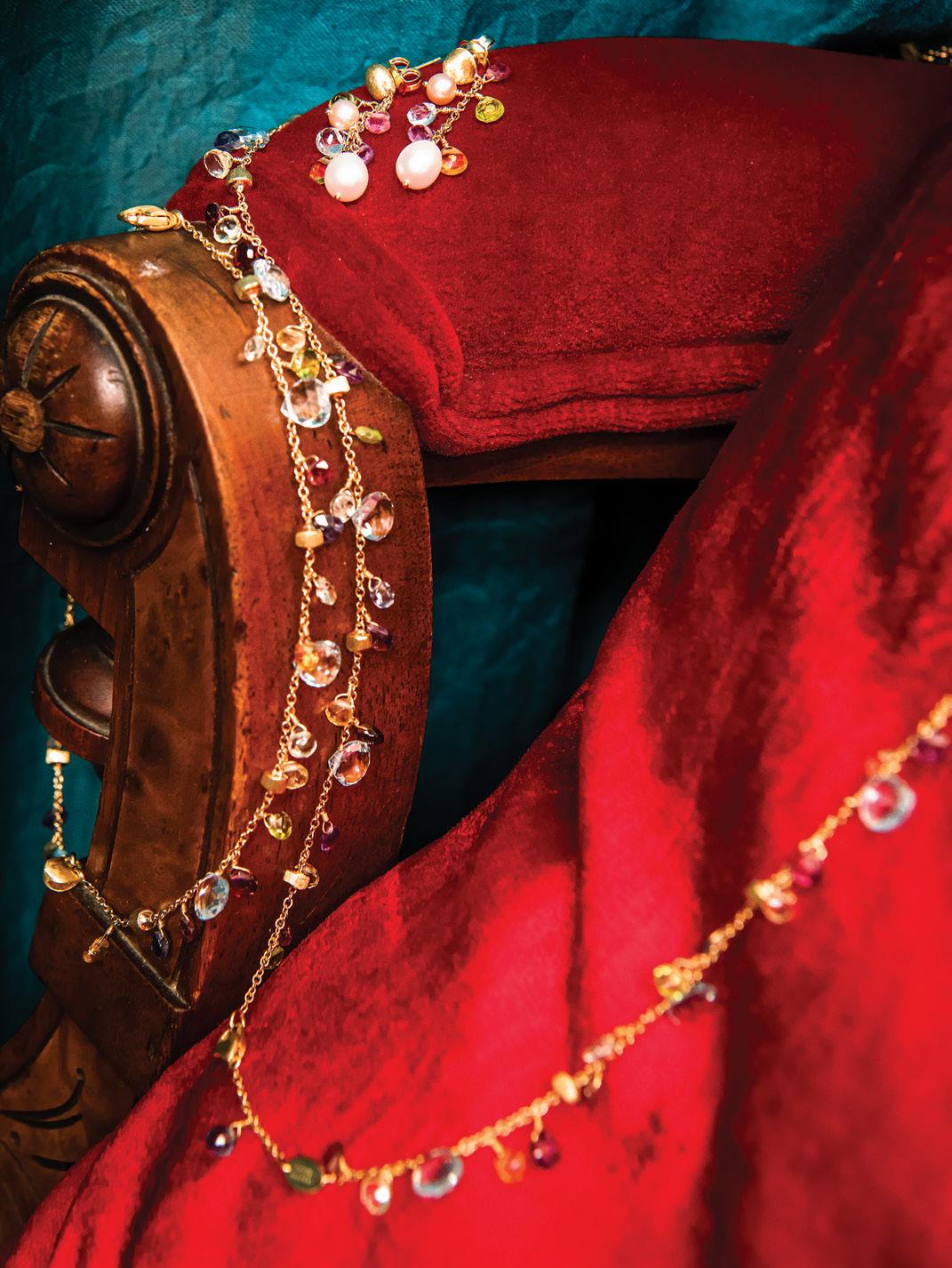 18 karat yellow gold necklace, bracelet and earrings by Marco Bicego. The Paradise Collection features hand engraved gold beads, blue topaz and mixed gemstones. All from DC Taylor Jewellers, Downtown Collingwood.