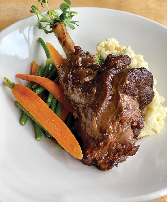 changed hands three times since Zingg sold in 1997, but the menu—virtually unchanged for more than 40 years—is as reliable as the white stucco walls, wooden tables, and other original décor. The authentic cow bells once dangled from the necks of herds that travelled to and from the high meadows of the Swiss Alps—some have the names of their farms etched on them. The horn—yep, an actual alphorn—also came from Switzerland, and in pre-covid times was a major attraction for children looking to make a lot of noise. The restaurant has become known for good-naturedly poking fun at Houston’s mother-in-law on its roadside sign, and the Alphorn’s famed birthday song has serenaded hundreds of people into their next turn around the sun. Then there’s—the rest. Think: beer passports tucked in every nook of the cozy bar, signs of beers of the world, flags, giant Swiss watches, taxidermy animals and fish, and scads of ski paraphernalia including old skis, autographed photos of famous racers and local teams, racing bibs, and much more.