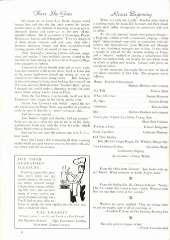 When is a rally not a rally? Possibly when held in a drawing room , for Louis XV furniture and Baby Grand pianos seem rather incongruous in connection with such . an affair. All the truly essential factors were present thougha laughing, spirited crowd-community singing-" talent night" entertainment-pep talks in connection with sub· scribers and subscriptions-] ane M ycroft and Margaret Feye, our circulation managers saw to that. It was really a wonderful send-off for the vacation starting o n Friday, and a "smooth " method of placing a subscription drive before our student body just in time for two whole weeks in which to solicit new readers. January will prove our success or failure. In the meantime, you might like to have an idea of the talent unearthed by Ebb Tide. The program was as follows: Musical Plea for Subscriptions Barbara Brothers and company Pep Talk