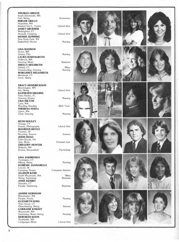 THOMAS GREENE So uth Dartm ou th , MA Golf, Skiing MIRIAM GRILLO Hop ed a le , MA Student Gov't., T ennis JANET GRUENER Wallingford , CT An imals, Ca mp ing DENISE GUNNING New Hyd e Par k, NY Basketball, Horses LISA HADDON Dover , MA Dra ma , Film LAURA HARTSGROVE Holbrook , MA Dancing, Music SHELLY HELDRETH Enfield, CT Cheerlead ing, Dancing MARGARET HELSABECK Westb ook, CT Choir, Skiing TRACY HENDRICKSON Bloom ington , MN Art, Skiing KATHLEEN HIGGINS Palm Ha rbor , FL Dancing, Dram a LISA HILTON Lynn , MA Bicycling, Reading THERESA HOELL Upt on, MA Choir, Da ncing BETH HOULEY O range, CT Dram a , Ph otography MAUREEN HOYLE T ivert on, RI Bicycling, Scie nce JOHN HUGO Fa lls C hurch, VA J azz, Music GREGORY HUNTER Walpole , MA Dram a , Racq uetb all LISA JAKIMENKO Torr ington, CT Hiking, Skiing DOMENIC JANNARELLI Lincoln, RI Ca mping, Peop le ALLIS ON KANE South Weymout h, MA Skiing, Swimm ing ANNE KENIRY Hamden, CT People , Swimmi ng JANINE KERSHAW Man ch est er, MA People , Poet ry ELIZABETH KING New Haven, CT Cheerl ead ing, Skiing LORRAINE KNIGHT Weymout h, MA Swimming, Wat er Skiing DEBORAH KOON Hyatt sville , MD Lan guages, Music