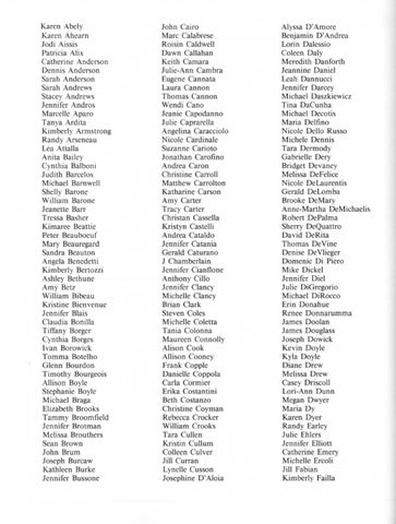 Karen Abely Karen Ahea rn Jodi Aissis Patri cia Alix Catherine Ande rson Dennis Ande rson Sarah Anders on Sarah Andrews Stacey And rews Jenn ifer And ros Marcelle Aparo Tanya Ardita Kimberly Arm strong Randy Arseneau Lea Attalla Anita Bailey Cynthia Balboni Judith Barcelos Michael Barnwell Shelly Baron e William Baron e Jean ett e Barr Tressa Basher Kimaree Beattie Peter Beauboeuf Mary Beauregard Sandra Beauton Angela Benedetti Kimberly Bertozzi Ashley Bethune Amy Betz William Bibeau Kristine Bien venu e Jennifer Blais Claud ia Bonilla Tiffany Borger Cynthia Borges Ivan Borowick Tomma Botelho Glenn Bourdon Timothy Bourgeois Allison Boyle Stephanie Boyle Micha el Braga Elizabeth Brooks Tammy Broomfield Jennifer Brotman Melissa Brouthers Sean Brown John Brum Jos eph Burcaw Kathleen Burke Jennifer Bussone
