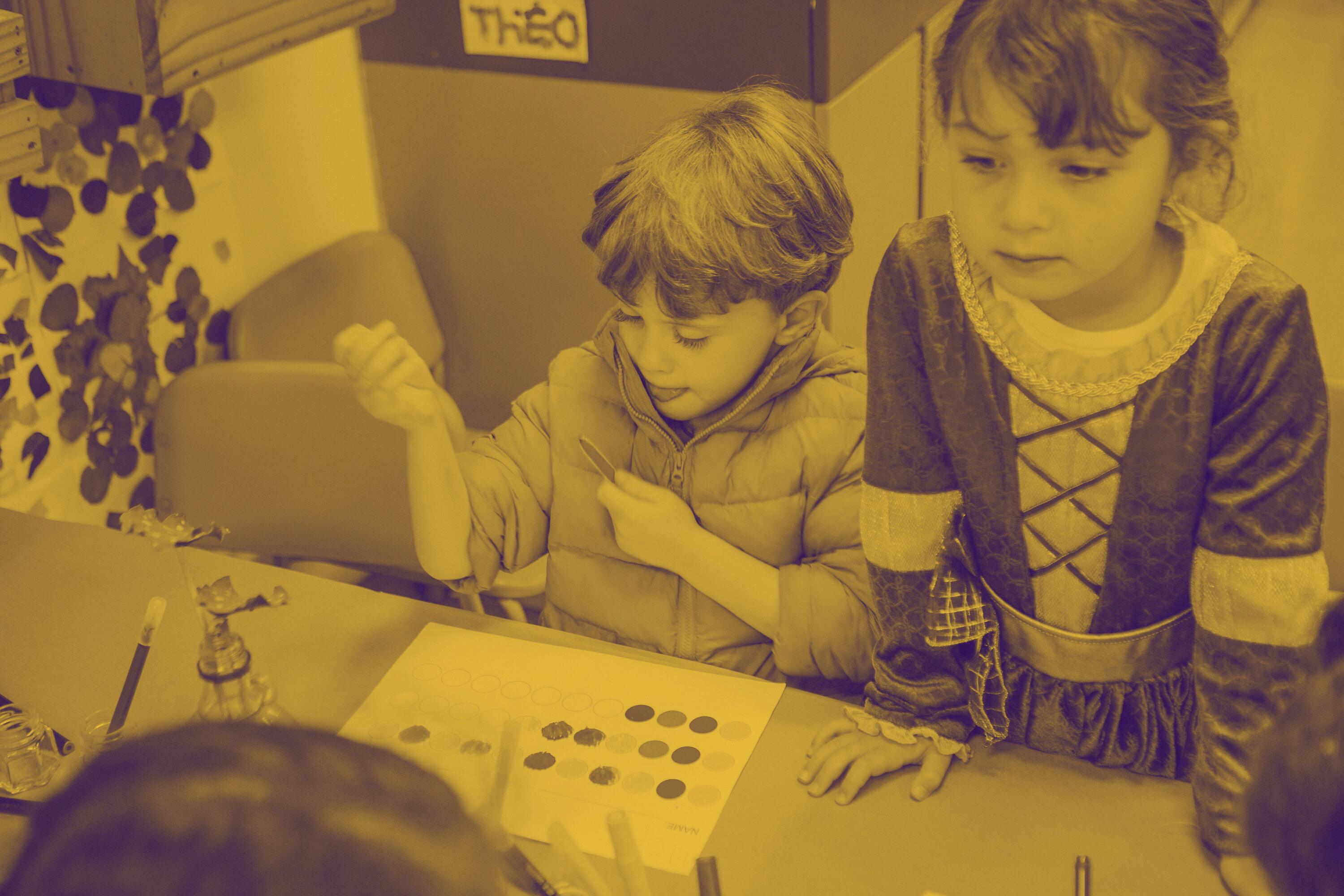 Express themselves through simplified back-and-forth movement and doodles in circular shapes (random motor experimentation), experimenting with materials, textures, and colors.