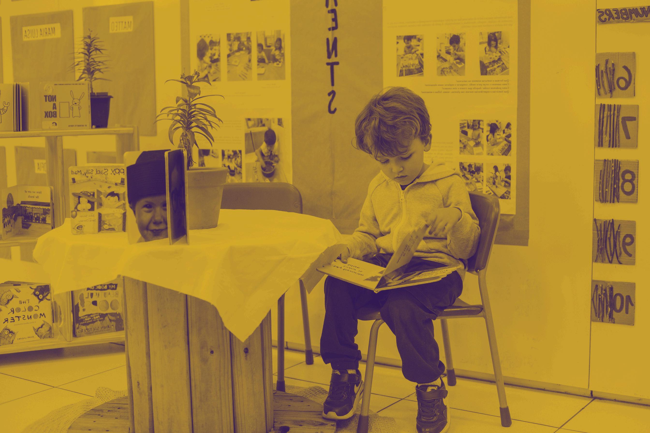 Imitar o comportamento de leitura do(s) educador(es) e/ou de outros adultos, orientando-se por imagens e algumas pistas textuais, como ilustrações, palavras familiares e repetições.