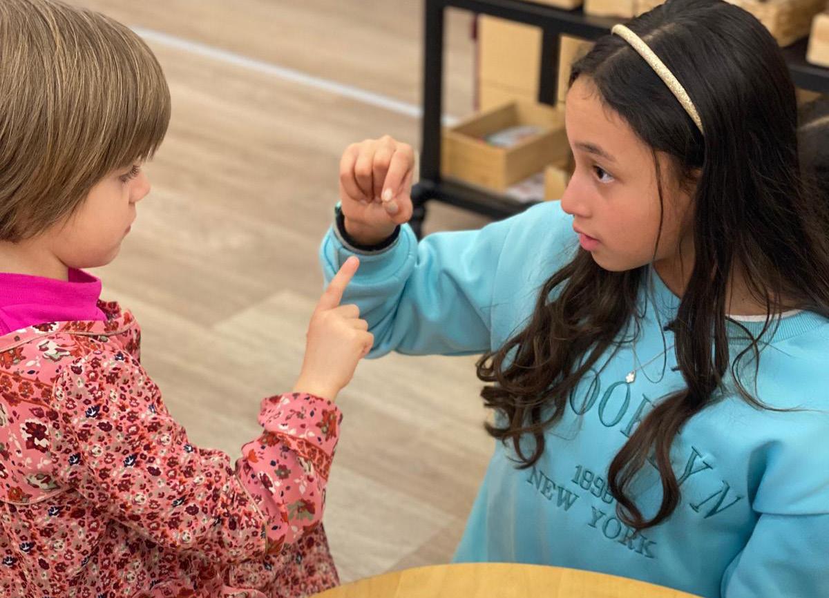 — Doncs sí, per exemple, a la classe de llengua de signes a vegades juguem al “telèfon”, però adaptat. Sabeu com és el joc del telèfon? Un diu una cosa i l’últim repeteix el que ha entès. Doncs aquí ho fem igual, però en llengua de signes. Ens posem en fila, un explica una cosa amb signes i l’últim ha de dir què ha entès. A vegades el missatge canvia molt i ens en riem molt!