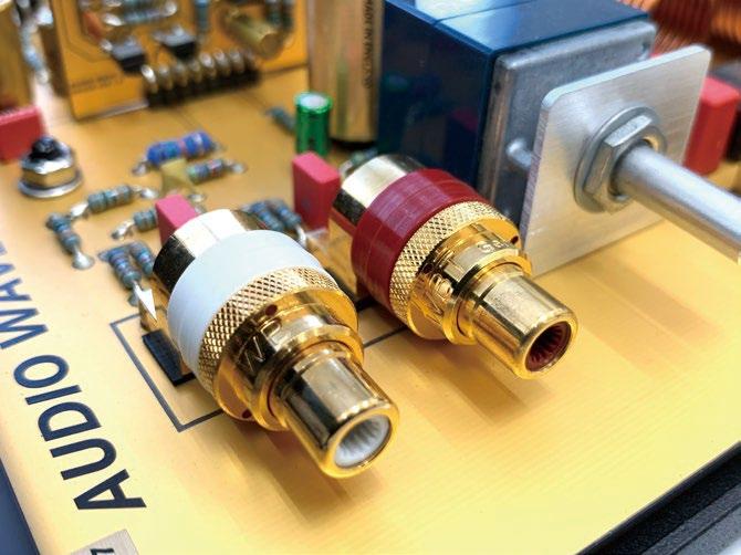 PCBは3オンスの金メッキで表面処理したゴールド仕様の両面基板で、新開発のAUDIO WAVE Dual Op Ampを 搭載するとともにAUDIO WAVE × Nichicon社製Gold Tune CapやTakman Electronicsのオーディオ抵抗器、 ALPS ALPINE社製ゲインコントローラー、RCA入力端子にはアクティブスプリングコンタクト採用のWBT社製コアキ シャルソケットを採用。他にも真鍮のブロックを贅沢に用いたパワー&スピーカーターミナルなど、美しいアクリルパネル 越しに見えるのは、音質最優先でセレクトされた「世界中の銘品パーツ」が織りなす、緻密でメカニカルな独創空間。 すべては、限りなくリアルな音楽再生のために…。このパワーアンプでしか聴くことのできない「別格の音」に触れて ください。