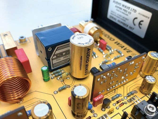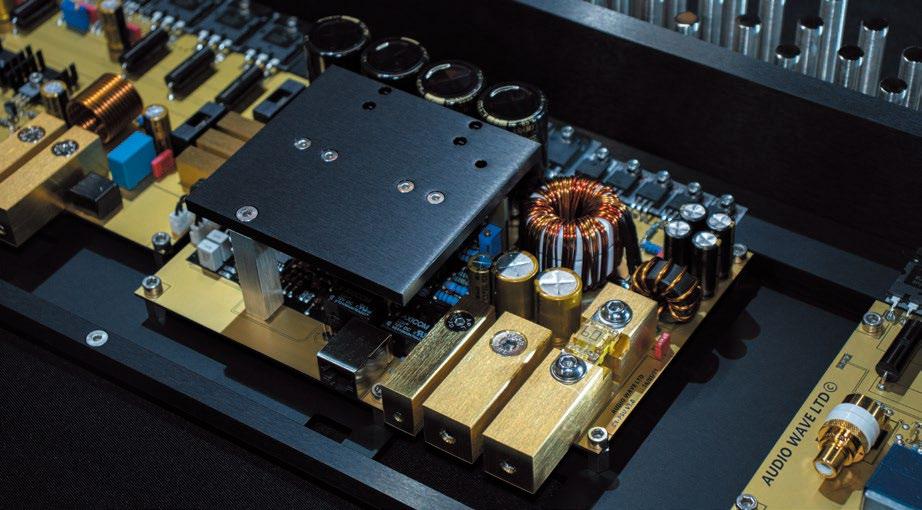 冷却効率の高い大型ヒートシンクを備えたPCBは3オンスの金メッキで表面処理したゴールド仕様の両面基板で、 新開発のAUDIO WAVE Dual Op Ampを搭載するとともにAUDIO WAVE × Nichicon社製のオーディオファイル Gold TuneキャパシタやTakman Electronics社製レジスタなどスペシャルオーダーした最高級グレードの 音響パーツ類を惜しみなく投入。トップパネルは従来型の樹脂+アクリルから、ステンレス+耐熱性・耐衝撃性に優れた ポリカーボネート製のクリアパネルへとアップグレード。AUDIO WAVE LTDの技と感性が極めたフルディスクリート 構成のAB級2チャンネルパワーアンプです。
