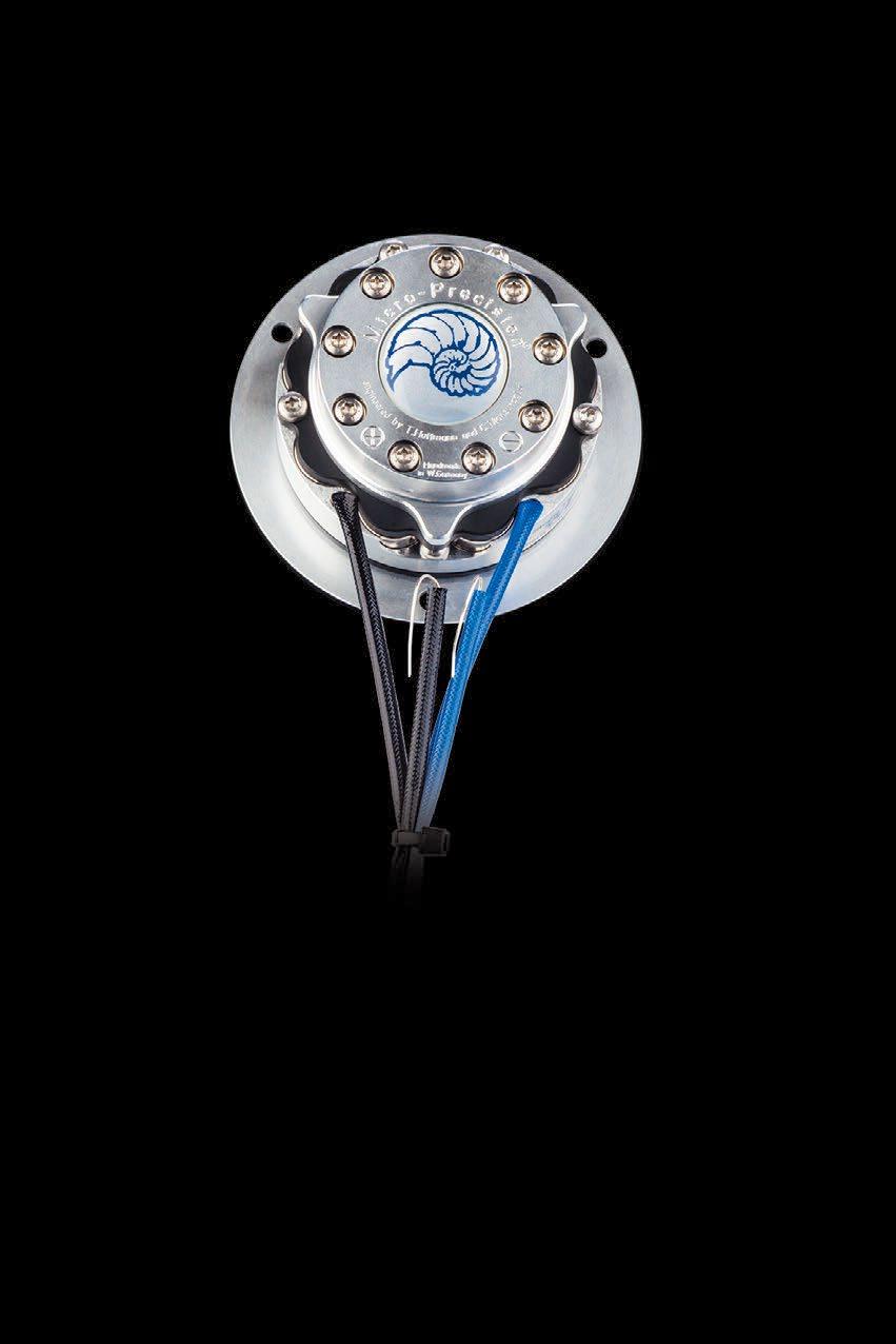 質量わずか0.81g のλ(ラムダ)サンドイッチコーン振動板をM8に 改良進化させたことにより周波数レンジの拡張を実現。フレームは高精度な アルミ切削筐体と3 本の真鍮製シャフトによって構成。磁気回路は 25mm 径ボイスコイルと小型ながら強力なネオジウムマグネットを搭載。 マグネット裏には中央の通気孔を取り囲むように9 個の通気孔を、マグ ネット側面には33 個もの通気孔を設けることで抜けの良さと放熱性を 極めています。