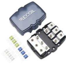 RECOILのヒューズホルダー、ディストリビューションブロックは耐腐食性に優れたサテンクロム仕上げで高温用 ポリカーボネートベースとカバーにより絶縁と保護を高めています。また製品によりヒューズやバスバーも付属 されているオールインワンパッケージとなっています。