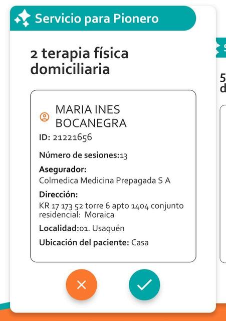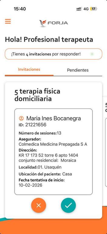 Cada paciente es una nueva invitación que podrás aceptar o rechazar, allí encontrarás toda la información disponible y te irán apareciendo una tarjeta a la vez, lo que significa que deberás aceptar o rechazar cada tarjeta para pasar a la siguiente.