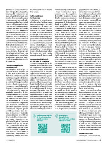 que de hechos constatados, Escuelas Católicas decidió valorar positivamente la intención de la Fiscalía General del Estado de iniciar contactos con nuestro sector para establecer cauces de comunicación y colaboración, viendo esta situación como una oportunidad de convertirse en pionera en las garantías de los derechos de los menores y personas en situación de vulnerabilidad. Por ello, Escuelas Católicas solicitó una reunión urgente con los máximos responsables del Ministerio de Justicia y de la Fiscalía General del Estado, si bien con desigual fortuna. En efecto, por parte del Ministerio de Justicia no se ha recibido respuesta alguna a la petición, quizá porque se carece de argumentos para explicar razonablemente la petición de informe. Sin embargo, la Fiscalía sí procedió a concertar de forma casi inmediata una reunión a través del Fiscal de Sala Coordinador de Menores, José Javier Huete Nogueras, lo que ha permitido iniciar una colaboración a todas luces necesaria, con base en el compromiso compartido por ambas instituciones de mejorar los mecanismos de prevención y dar una respuesta eficaz y coordinada frente a estos delitos. Ahora nos queda confiar ilusionadamente en que este trabajo conjunto con la Fiscalía dé los esperados frutos y nos permita avanzar hacia una sociedad más respetuosa con el derecho a la integridad de los menores y de las personas en situación de vulnerabilidad, si bien hemos de ser conscientes de que es necesaria una adecuada formación afectivosexual y de respeto al otro para lograr que desaparezcan, o al menos se reduzcan al mínimo posible, las agresiones y abusos sexuales en la sociedad actual; objetivo con el que Escuelas Católicas también se encuentra activamente comprometida. JUAN MANUEL RUIZ Director Dpto. Jurídico-Económico EC revista de escuelas católicas
