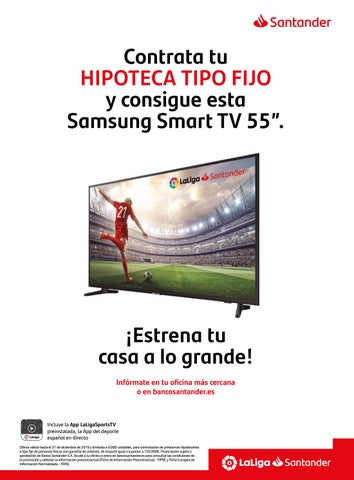 Incluye la App LaLigaSportsTV preinstalada, la App del deporte español en directo Oferta válida hasta el 31 de diciembre de 2019 y limitada a 6.000 unidades, para contratación de préstamos hipotecarios a tipo fijo de personas físicas con garantía de vivienda, de importe igual o superior a 150.000€. Financiación sujeta a aprobación de Banco Santander S.A. Acude a tu oficina o entra en bancosantander.es para consultar las condiciones de la promoción y obtener la información precontractual (Ficha de Información Precontractual - FIPRE y Ficha Europea de Información Normalizada - FEIN).