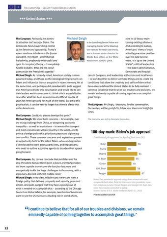 The European: Politically the domesnine in 10 favour mainMichael Singh tic situation isn’t easy for Biden. The taining existing alliances. is the Lane-Swig Senior Fellow and Democrats have a razor-thing control And according to Gallup, managing director at The Washingof the Senate and apparently, Trump’s Americans’ views of trade ton Institute for Near East Policy, voters continue to believe in the former actually grew more positive and a former senior director for president. This Right – protectionist, over the past several Middle East affairs at the White isolationist, profoundly mistrustful and years. It is up to the United House from 2005 to 2008. photo: Lloyd Wolf open to conspiracy theory – is completely States’ political leadership hostile to Biden. What are the conse– the Biden administration, quences for the President’s agenda? Democrats and RepubliMichael Singh: As I already noted, American society is more cans in Congress, and leadership at the state and local levels polarised today, and those on the ideological fringes more con– to work together to deliver on these things and to create the fident and influential than at any point in recent memory. Yet at conditions that allow the creativity and self-confidence that the same time, and perhaps a bit paradoxically, polls suggest have always defined the United States to be fully realised. I that Americans dislike this polarisation and would like to see continue to believe that for all of our troubles and divisions, we their leaders work to overcome it. I think this is especially the remain eminently capable of coming together to accomplish case after what has been an enormously difficult couple of great things. years for Americans and for much of the world. But amid this polarisation, it can be easy to forget that there is plenty that The European: Mr Singh, I thank you for this conversation. unites Americans. Our readers will be grateful to follow your ideas and insightful views. The European: Could you please develop this point? Michael Singh: We share both concerns – for example, over The interview was led by Nannette Cazaubon. the rising challenge from China, or deepening economic inequality – as well as aspirations – to remain the strongest and most economically vibrant country in the world, and to devise a foreign policy that prioritises peace and diplomacy over conflict. These common concerns and aspirations present an opportunity both for President Biden, who campaigned as a centrist able to work across party lines, and Republicans, who need to outline a positive agenda to broaden their appeal going forward.