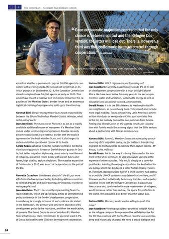 establish whether a permanent corps of 10,000 agents is consistent with existing needs. We should not forget that, in its initial proposal of September 2018, the European Commission aimed to deploy those 10,000 agents as early as 2020. That would have meant a massive and immediate impact on the capacities of the Member States’ border forces and an enormous logistical challenge! A progressive build-up is therefore key. Hartmut Bühl: Border management is a shared responsibility between the EU and individual Member States. Minister, what is the role of each? Jean Asselborn: The main role of Frontex is to act as a readily available additional source of manpower if a Member State comes under intense migratory pressure. Frontex can only become operational at an external border with the explicit agreement of the host Member State, and it discharges its duties under the operational control of its hosts. Gerald Knaus: What we need for humane control is not Romanian border guards in Greece or Danish border guards in Ceuta, but better migration diplomacy, more orderly resettlement of refugees, a realistic return policy with cut-off dates and faster, high quality, asylum decisions. The massive expansion of Frontex since 2015 was an act of desperation on the part of the EU. Nannette Cazaubon: Gentlemen, shouldn’t the EU put more effort into its development policy by helping African countries to combat drought and water scarcity, for instance, in order to make people stay? Jean Asselborn: The EU is currently implementing Team Europe Initiatives, which are specifically aimed at strengthening policy coherence in the field of development cooperation. Luxembourg is strongly in favour of such policies. As stated in the EU treaties, the primary and long-term objective of EU development policy is the reduction, and then the eradication, of poverty. The Grand Duchy is one of only four EU Member States that honour their commitment to spend at least 0.7% of Gross National Income (GNI) on development cooperation.