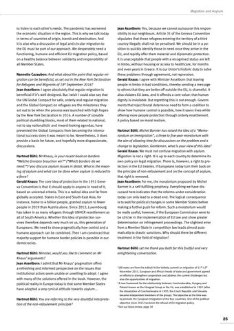 to listen to each other’s needs. The pandemic has worsened the economic situation in the region. This is why we talk today in terms of countries of origin, transit and destination. And it is also why a discussion of legal and circular migration to the EU must be part of our approach. We desperately need a functioning, humane and efficient EU migration policy, based on a healthy balance between solidarity and responsibility of all Member States. Nannette Cazaubon: And what about the point that regular migration can be beneficial, as set out in the New York Declaration for Refugees and Migrants of 18th September 2016? Jean Asselborn: I agree absolutely that regular migration is beneficial if it’s well designed. But I wish I could also say that the UN Global Compact for safe, orderly and regular migration and the Global Compact on refugees are the milestones they set out to be when the process was launched with high hopes by the New York Declaration in 2016. A number of sizeable political stumbling blocks, most of them related to national, not to say nationalistic and inward-looking agendas, have prevented the Global Compacts from becoming the international success story it was meant to be. Nevertheless, it does provide a basis for future, and hopefully more dispassionate, discussions. Hartmut Bühl: Mr Knaus, in your recent book on borders “Welche Grenzen brauchen wir?” (“Which borders do we need?”)3 you discuss asylum issues in detail. What is the meaning of asylum and what can be done when asylum is reduced to a farce? Gerald Knaus: The core idea of protection in the 1951 Geneva Convention is that it should apply to anyone in need of it, based on universal criteria. This is a radical idea and far from globally accepted. States in East and South-East Asia, for instance, home to 4 billion people, granted asylum to fewer people in 2019 than Austria alone. Since 2013, Luxembourg has taken in as many refugees through UNHCR resettlement as all of South America. Whether this idea of protection survives therefore depends very much on us, this generation of Europeans. We need to show pragmatically how control and a humane approach can be combined. Then I am convinced that majority support for humane border policies is possible in our democracies. Hartmut Bühl: Minister, would you like to comment on Mr Knaus’ arguments? Jean Asselborn: I admit that Mr Knaus’ pragmatism offers a refreshing and informed perspective on the issues that institutional actors seem unable or unwilling to adopt. I agree with many of the solutions offered in the book. However, the political reality in Europe today is that some Member States have adopted a very cynical attitude towards asylum... Hartmut Bühl: You are referring to the very doubtful interpretation of the non-refoulement principle?