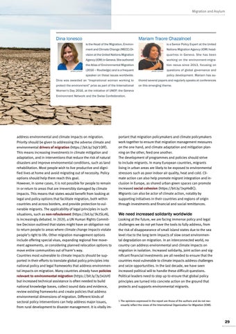 We need increased solidarity worldwide Looking at the future, we are facing immense policy and legal challenges we do not yet have the tools to fully address, from the risk of disappearance of small island states due to the sea level rise to the long term impacts of slow onset environmental degradation on migration. In an interconnected world, no country can address environmental and climate impacts on migration in isolation. Increased solidarity, joint action and significant financial investments are all needed to ensure that the countries most vulnerable to climate impacts address challenges and seize opportunities. In the last decade, we have seen increased political will to handle these difficult questions. Political leaders need to step up to ensure that global policy principles are turned into concrete action on the ground that protects and supports environmental migrants.
