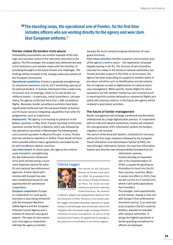Vulnerability assessments are another example of the strategic and sensitive nature of the new tasks entrusted to the agency. The first strategic risk analysis was delivered last year to EU institutions and member states with the intention of providing foresight on the future threats and challenges. The findings will be included in the strategic policy documents of the European Commission. Operational capabilities: Frontex is gradually strengthening its situational awareness and its 24/7 monitoring capacity of EU external borders. It receives information from a wide array of sources and, increasingly, relies on its own border surveillance means – in particular, aerial surveillance. Last year alone, the agency conducted more than 1,000 surveillance flights. Moreover, border surveillance activities have been significantly reinforced over the last years thanks to Eurosur and its fusion services integrating capabilities from other EU The future of border management programmes, such as Copernicus. Border management will undergo a profound transformation Deployment: The agency is increasing its presence in the underpinned by a large digitalisation process. In cooperation Balkan countries. In May 2019, Frontex launched its first joint with eu-LISA and national authorities, Frontex will establish operation outside the EU in Albania, which was followed by the next generation of EU information systems for borders, two operations launched in Montenegro the following year migration and security. and a second operation in Albania this year. In June, Frontex The launch of the Entry Exit System, scheduled for next year, also has started an operation in Serbia. These would not have will be this first major milestone followed by the European been possible without status agreements concluded by the Travel Information and Authorisation System (ETIAS), the EU with the Western Balkan countries. new Schengen Information System, the new Visa Information Law enforcement: In recent years, the agency has continuSystem and also the new interoperability framework for EU ously invested in strengthening information systems. the law enforcement dimension Frontex will play an important of its work and becoming a much role in the implementation of more important partner for other ETIAS, a system for granting auFabrice Leggeri EU and national law enforcement thorisation to travel into the EU has served as the Executive agencies. A more robust partfrom visa-free countries. When Director of Frontex since Janunership with Europol has also it comes into effect in 2022, Fronary 2015. He graduated from been established based on new tex will run the 24/7 Central Unit, the Institut d’Etudes Politiques opportunities for operational where it will verify applications de Paris, the Ecole normale cooperation. from travellers. supérieure and Ecole nationale photo: Klaus Dombrowsky European cooperation: EuropeThe stronger, more operationally d’administration. He received an cooperation on coast guard active Frontex, relying on law and a Master’s degree and postgraduate diploma from functions is also being reinforced with Europe’s first uniformed enthe University of Paris. Previous to his current post, with the European Maritime forcement service, is an essential Mr Leggeri developed extensive expertise in issues Safety Agency and the European actor to protect the EU’s external related to the Schengen area and border control and Fisheries Control Agency and a borders, shoulder-to-shoulder migration with a European angle, working at France’s network of national coast guard with national authorities. It ministries of interior and defence, as well as at the experts. This type of cross-sector brings the highest standards in European Commission. He applied this knowledge on and cross-agency cooperation border guarding everywhere its the ground as a Vice-Prefect in two French regions. will help the agency to further officers are deployed.