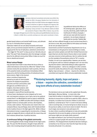 ing additional destructive effects on the drinking water, agriculture, food photo: private security, electricity, public health and she worked for People in Need (PIN) in Dahuk, Iraq and the livelihoods of millions of people. I Norwegian Refugee Council in Erbil, Iraq, before joining SOS Mediterranée Germany will not even start with the Covid-19 in Berlin in 2018. She is currently working as an inter sector coordinator in Syria. pandemic. As one Syrian displaced family told me recently “Habibti (My dear), we have suffered through so much and we know there is gender-based violence and mental health issues, and ultimateyet more to come. We cannot afford to think about and frankly ly a rise in criminality driven by despair. we do not care about Covid-19.” If decision makers do not care about humanity and human Governments and their humanitarian departments turn to us rights, let me just remind everyone that this is a perfect breedhumanitarians on the ground to receive briefings on needs, ing ground for the rise of radicalism, extremism and terrorism gaps and context updates and with their limited financial enve– the trigger for “the west” to step up and act. But why only act lopes they try to do their best to finance what is most needed when “the west” feels threatened, when the damage is already and raise concerns to their politicians. But it is neither the job done for the affected communities? When it takes so much for nor the mandate of humanitarian action to “fix” a country. time to rebuild and recover? Frankly, it is not in our capacity either. However, we are here, on the ground, with our national colleagues and I can see every Mosul versus Raqqa day that the world is collectively failing to really support the Iraq and Syria have made it clear where the focus of the soaffected population – talk to my colleagues in other contexts called international community lies. When the “defeat” of the around the world, they witness the same. Restoring humanity, common enemy ISIL was declared in both countries, the focus dignity, hope and peace – a future – requires the collective, of the powerful media and politicians immediately shifted committed and long-term efforts of every stakeholder involved. away and so did the funding priorities of institutional humanitarian donors. Right in the moment where a window of opportunity opened up to work on more durable solutions for displaced populations, returnees and host communities, both UN agencies and NGOs had to cut budgets, close down projects, take national colleagues off their payrolls The decisions to do so are made at the capital level: Brussels, and people in need off their beneficiary lists. Washington, Moscow, Beijing – to name only a few. In Iraq at least, development actors stepped up for more It was hard to realise in my work that it is indeed a political mid- and long-term solutions, but in Syria, due to the political decision to ensure that no child has to work for US$1 a day at a context there is no World Bank to work on ways to rebuild the dumpsite, no mother has to lose her children in aerial bomcrippled economy, no UNDP and alike with funding to rebuild bardment, no family has to “live” in a tent in the bone-chilling people’s homes or at least public services, like hospitals, cold or scorching heat, no human being has to drown at sea on schools, water stations. That becomes ever clearer when one the journey to safety, no one has to starve to death. This list is compares Mosul, Iraq and Raqqa, Syria, both heavily bombed much longer, but everyone is very well aware of it. by the Coalition Forces in the fight against ISIL. While in Mosul So why is there no political willingness to truly and sustainably international money is supporting the reconstruction, in Raqqa dismantle this list across the globe so that one day humanity people are largely left alone to rebuild with the means they and and human rights are not empty shells anymore? their relatives abroad have. A political decision. You might not believe it, but I am fond of my work and I will continue to support people who were forced into inhumane A continuous failing of the global community conditions. The disappointment of political decision-making is The looming global climate change already hit the region years constantly on my mind, but I also have the hope that one day ago. This year the FAO declared a drought in Syria while the humanity will prevail. It is a decision. water crisis including along the Euphrates River starts showstarted her professional career with Welthungerhilfe, first in Gaziantep, Turkey and later in Iraq. Between 2016 and 2018
