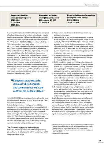 The International Organization for Migration (IOM) has reported that more than a dozen recent shipwrecks off the coast of Libya and elsewhere have pushed the death toll in the Mediterranean Sea since 2014 to over 20,000. 2 IOM, Missing Migrants Project, https://missingmigrants.iom.int/, last update 26th of May 2021 3 https://tinyurl.com/44ju8rwe 1