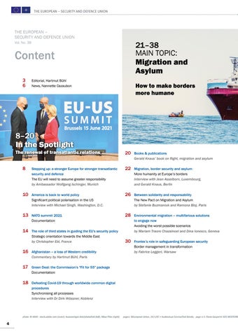 Between solidarity and responsability The New Pact on Migration and Asylum by Stefanie Buzmaniuk and Ramona Bloj, Paris Environmental migration – multifarious solutions to engage now Avoiding the worst possible scenarios by Mariam Traore Chazalnoel and Dina Ionesco, Geneva Frontex’s role in safeguarding European security Border management in transformation by Fabrice Leggeri, Warsaw