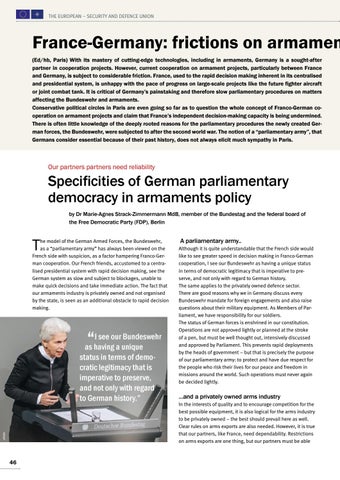 he model of the German Armed Forces, the Bundeswehr, as a “parliamentary army” has always been viewed on the French side with suspicion, as a factor hampering Franco-German cooperation. Our French friends, accustomed to a centra lised presidential system with rapid decision making, see the German system as slow and subject to blockages, unable to make quick decisions and take immediate action. The fact that our armaments industry is privately owned and not organised by the state, is seen as an additional obstacle to rapid decision making.