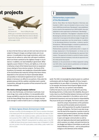world. The USA is increasingly focusing its power on a political confrontation with the People’s Republic of China. Europe’s responsibility for its own affairs is increasing. The focus here is, for example, the German-French-Spanish fighter aircraft system, FCAS. Here, too, our partners need reliability. It will be the task of us all, and not only after the upcoming We need a strong European defence Bundestag elections, to fully restore this reliability. Because it It is also clear that Europe, and Germany in particular, must is also clear to us that friendship between Germany and France come of age. Even under Joe Biden, it is not possible within and Franco-German cooperation in the defence sector are of Europe and NATO to stand on the side lines and rely on the US fundamental importance and must be based on dependability. to do the heavy lifting! Those days are over. Europe must beThey must not be put at risk lightly. The French need to undercome stronger in order to hold its own in a changed, multipolar stand the unique characteristics of the parliamentary army and the privately owned armaments sector, which guarantees the quality of equipment Dr Marie-Agnes Strack-Zimmermann MdB through competition. The French must also recognise the lead of the respective countries in joint arhas been a member of the Bundestag since 2017. She is a member of the board maments procurement projects, but they naturally of the liberal party FDP and spokeswoman for local politics and defence. Born expect reliability. What is needed in cooperation in 1958 in Düsseldorf, she studied journalism, politics and German in Munich is open and regular communication as well as and received her PhD in 1986. From 1988 to 2008 she was a representative for clear and rigorously observed export guidelines to youth book publisher TESSLOFF. Having started her political career in the FDP which everyone can adapt, and quick decisions by in 1999, Ms Strack-Zimmermann became deputy mayor of Düsseldorf in 2008 the Budget and Defence Committees as well as the and was co-chair of the FDP (local politics, social affairs, public health) from Federal Ministry of Finance – and no party-political 2013 to 2019. intrigues to the detriment of the military!