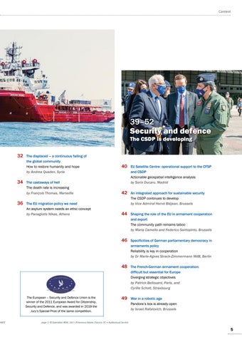 EU Satellite Centre: operational support to the CFSP and CSDP Actionable geospatial intelligence analysis by Sorin Ducaru, Madrid An integrated approach for sustainable security The CSDP continues to develop by Vice Admiral Hervé Bléjean, Brussels Shaping the role of the EU in armament cooperation and export The community path remains taboo by Maria Camello and Federico Santopinto, Brussels Specificities of German parliamentary democracy in armaments policy Reliability is key in cooperation by Dr Marie-Agnes Strack-Zimmermann MdB, Berlin The French-German armament cooperation: difficult but essential for Europe Diverging strategic objectives by Patrick Bellouard, Paris, and Cyrille Schott, Strasbourg War in a robotic age Pandora’s box is already open by Israel Rafalovich, Brussels