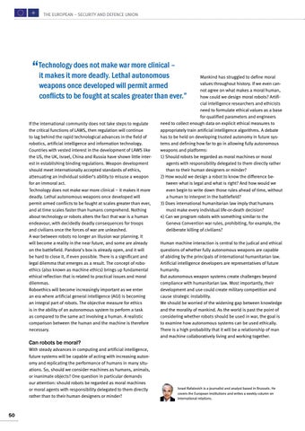 Mankind has struggled to define moral values throughout history. If we even cannot agree on what makes a moral human, how could we design moral robots? Artificial intelligence researchers and ethicists need to formulate ethical values as a base for qualified parameters and engineers need to collect enough data on explicit ethical measures to appropriately train artificial intelligence algorithms. A debate has to be held on developing trusted autonomy in future systems and defining how far to go in allowing fully autonomous weapons and platforms: 1) Should robots be regarded as moral machines or moral agents with responsibility delegated to them directly rather than to their human designers or minder? 2) How would we design a robot to know the difference between what is legal and what is right? And how would we even begin to write down those rules ahead of time, without a human to interpret in the battlefield? 3) Does international humanitarian law imply that humans must make every individual life-or-death decision? 4) Can we program robots with something similar to the Geneva Convention war rules, prohibiting, for example, the deliberate killing of civilians?