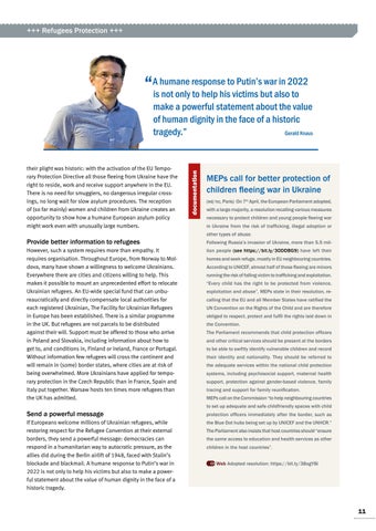lion people (see https://bit.ly/3ODDBG9) have left their homes and seek refuge, mostly in EU neighbouring countries. According to UNICEF, almost half of those fleeing are minors running the risk of falling victim to trafficking and exploitation. “Every child has the right to be protected from violence, exploitation and abuse”, MEPs state in their resolution, recalling that the EU and all Member States have ratified the UN Convention on the Rights of the Child and are therefore obliged to respect, protect and fulfil the rights laid down in the Convention. The Parliament recommends that child protection officers and other critical services should be present at the borders to be able to swiftly identify vulnerable children and record their identity and nationality. They should be referred to the adequate services within the national child protection systems, including psychosocial support, maternal health support, protection against gender-based violence, family tracing and support for family reunification. MEPs call on the Commission “to help neighbouring countries to set up adequate and safe childfriendly spaces with child