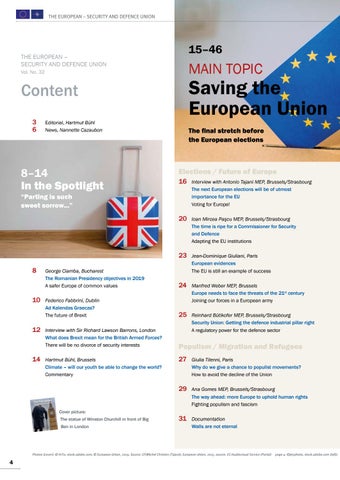 George Ciamba, Bucharest The Romanian Presidency objectives in 2019 A safer Europe of common values Federico Fabbrini, Dublin Ad Kalendas Graecas? The future of Brexit Interview with Sir Richard Lawson Barrons, London What does Brexit mean for the British Armed Forces? There will be no divorce of security interests