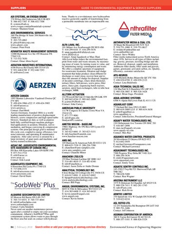 101 Milner Ave Scarborough ON M1S 4S6 T: 416-299-6101 F: 416-299-5476 E: anup.jagadeesh@alfalaval.com www.alfalaval.ca Contact: Anup Jagadeesh or Marc Hunt Alfa Laval helps reduce the environmental footprint from water and waste streams, by maximizing reuse of water, by turning waste to value, and by minimizing energy consumption and waste. We offer a complete spectrum of equipment for wastewater treatment, filtration and sludge treatment that helps produce clean effluent for discharge or water reuse, recover heat and reduce the amount of sludge for disposal. Supplier of decanter centrifuge, rotary drum thickener, tertiary filters, belt presses, screw press, filter press, sluice gate, sequencing batch reactors, aeration, spiral heat exchangers, tube in tube heat exchanger, MBR.
