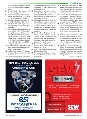 19. Maintain the applicability of ISO 14001 to small and medium-sized enterprises (SMEs). For example, by drafting simple and understandable requirements. 20. Consider the information given in the European Committee for Standardization’s Guide 17, guidance for writing standards, taking into account micro and SMEs’ needs. 21. Address life cycle thinking and the value chain perspectives more clearly in the identification and evaluation of environmental aspects related to products and services. 22. Include clear requirements and guidance on environmental strategy, design and development, purchasing, marketing and sales activities, in alignment with organizational priorities. 23. Introduce a more systematic approach to identifying, consulting and communicating with stakeholders on environmental issues, based on the Joint Technical Coordination Group’s text. continued overleaf...