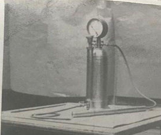 O aparelho era constituído por um reser vatório metálico na sua base, onde o ar era introduzido, conservado sob pressão e moni torizado por um manómetro (no topo), que comunicava com um tubo graduado em vidro. Aí, a solução de contraste – iodeto de sódio (Abrodil) – era misturada com o ar e seguia