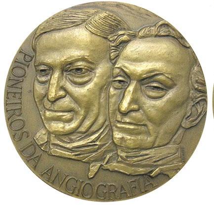 Medalha comemorativa da exposição itinerante internacional Pioneiros da Angiografia (1982), que homenageou as inovações desenvolvidas pelos médicos portugueses Egas Moniz e Reynaldo dos Santos.