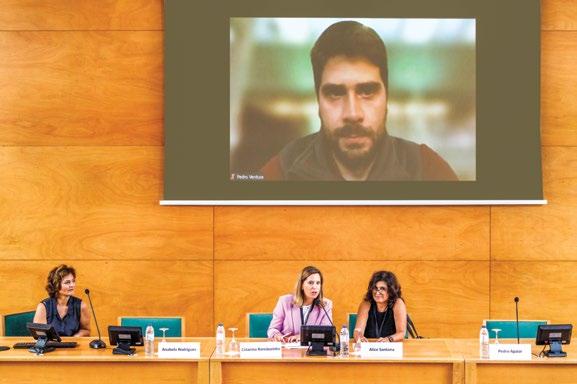 O Prof. Pedro Ventura Aguiar (no ecrã) participou à distância na discussão com a Prof.ª Anabela Rodrigues, a Dr.ª Catarina Romãozinho e a Dr.ª Alice Santana (da esq. para a dta.).