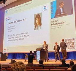 Ogrupo de investigação em de generescência macular da idade (DMI) da Associação para Investiga ção Biomédica e Inovação em Luz e Imagem (ABILI) foi premiado com o EURETINA Clinical Research Award 2022. A distinção foi atribuída no 22.º Congresso da European Society of Retina Specialists (EURETINA), que decorreu entre os dias 1 e 4 de setembro, em Hamburgo, na Alemanha. De acordo com a Dr.ª Cláudia Farinha, membro do grupo de investigação premiado, o projeto distinguido tem como objetivo analisar a epidemiologia e o impacto da DMI na população portuguesa, incidindo, sobretudo, nos fatores de risco genéticos, ambientais e nutricionais associados a esta patologia. “Ao contribuir para compreender os mecanismos patofisiológicos da DMI, podemos apostar mais numa Medicina preventiva ao invés de uma Medicina reativa. Por outro lado, aju damos ao desenvolvimento de novas tera pêuticas que atuem em fases mais precoces da doença”, salienta a também oftalmolo gista no Centro Hospitalar e Universitário de Coimbra.