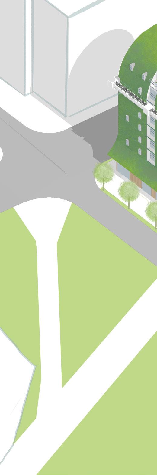 The street level is devoted to office space above retail shops along the ground level to engage the street.