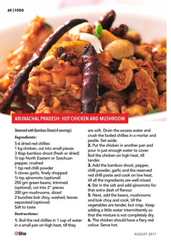 are soft. Drain the excess water and crush the boiled chillies in a mortar and pestle. Set aside. 2. Put the chicken in another pan and pour in just enough water to cover. Boil the chicken on high heat, till tender. 3. Add the bamboo shoot, pepper, chilli powder, garlic and the reserved red chilli paste and cook on low heat, till all the ingredients are well mixed. 4. Stir in the salt and add ajinomoto for that extra dash of flavour. 5. Next, add the beans, mushrooms and bok choy and cook, till the vegetables are tender, but crisp. Keep adding a little water intermittently so that the mixture is not completely dry. 6. The chicken should have a fiery red colour. Serve hot. AUGUST 2017