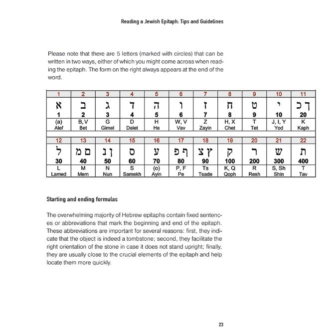 of text. Like any genre, it abides aph is unique and individual, but of structure and contain several ough identifying these elements, buried person’s name, gender and sufficient for research purposes. languages can be found, especially The focus of this section, howevversal Hebrew epitaphs. Therew alphabet is needed to use this table shows the correlation benumbers (gematria9). The latter
