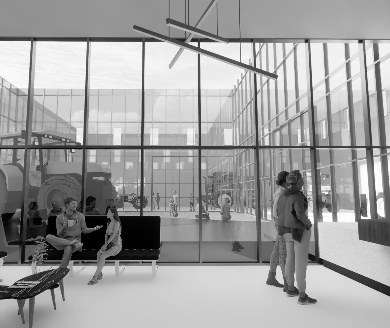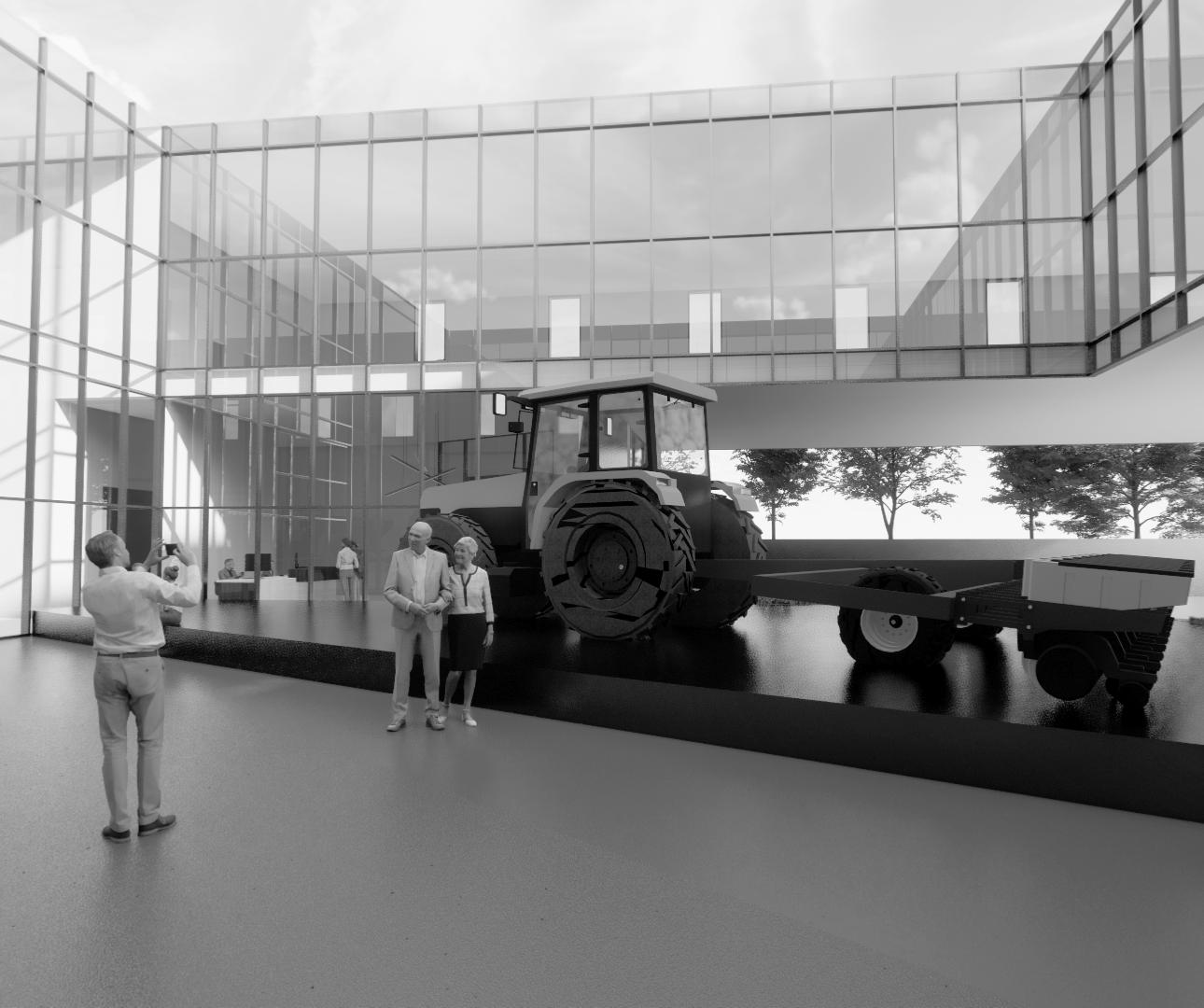 This space is meant to hold the larger agricultural artifacts and pieces that are used in the fields. The 30-foot ceilings and courtyard glazing allows for a sense of release from the lobby.