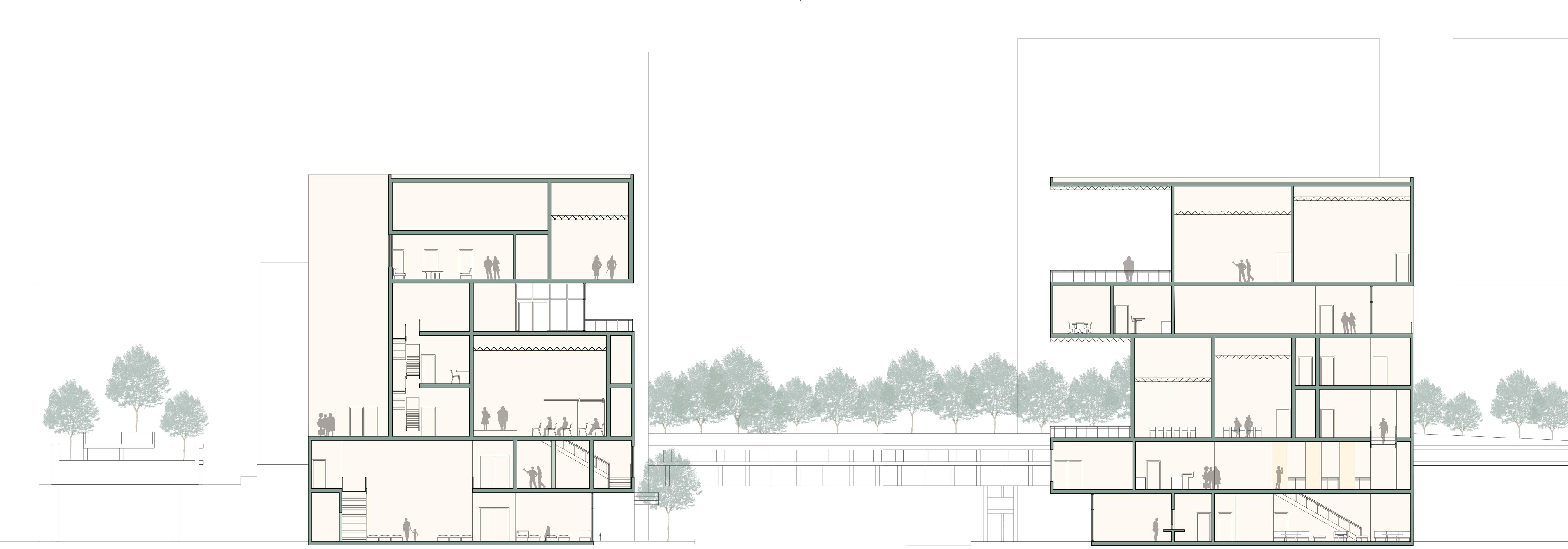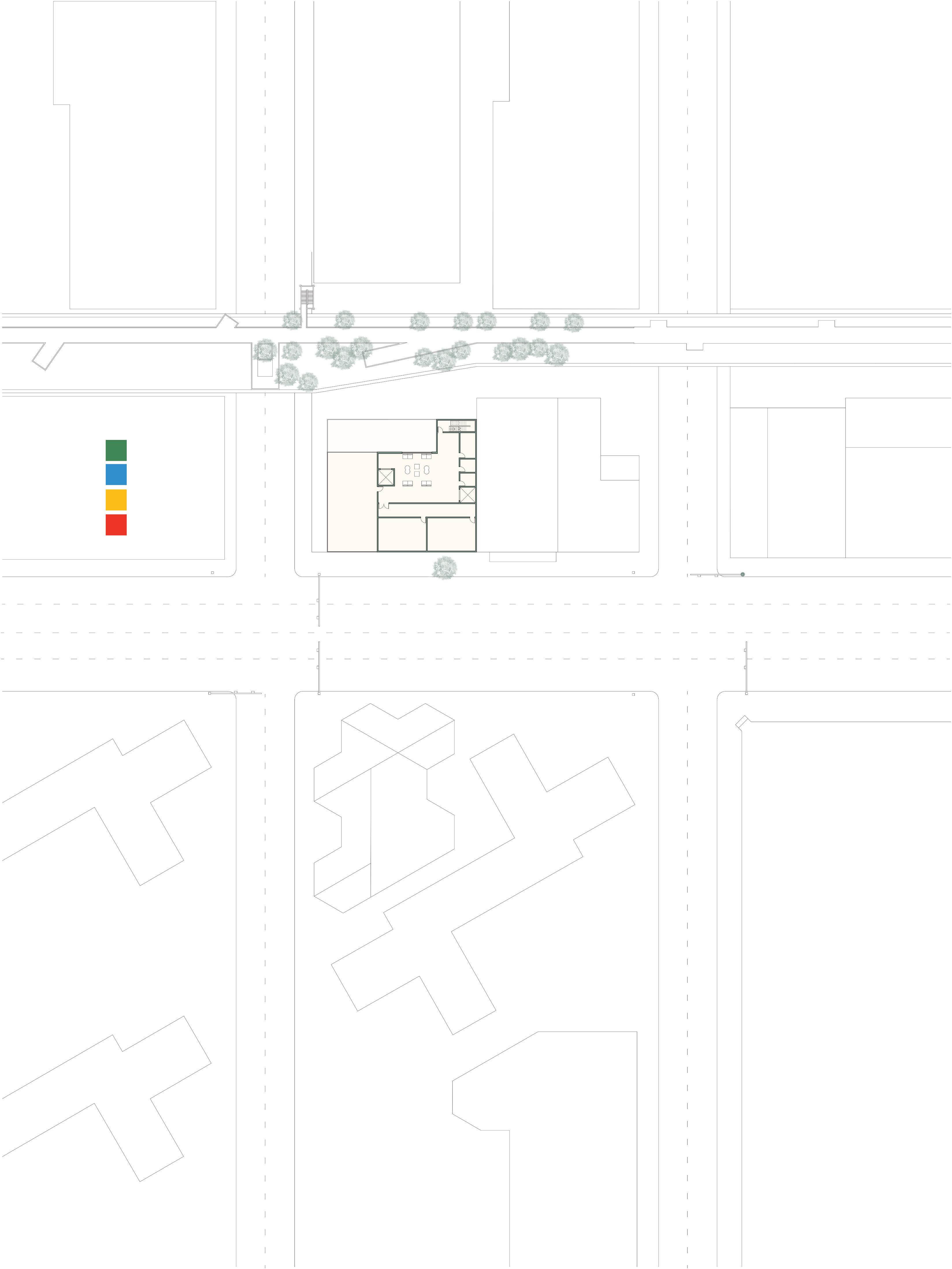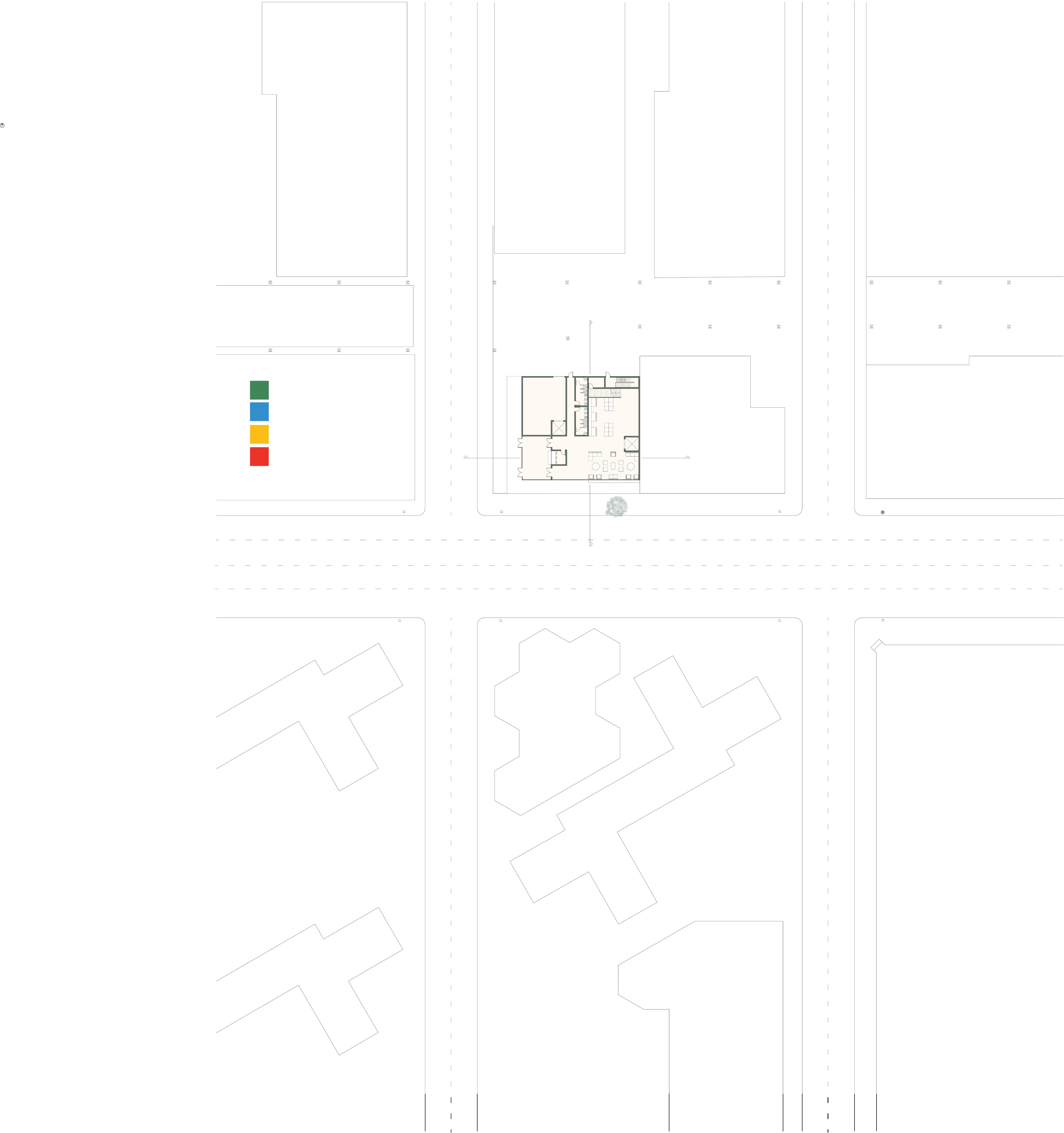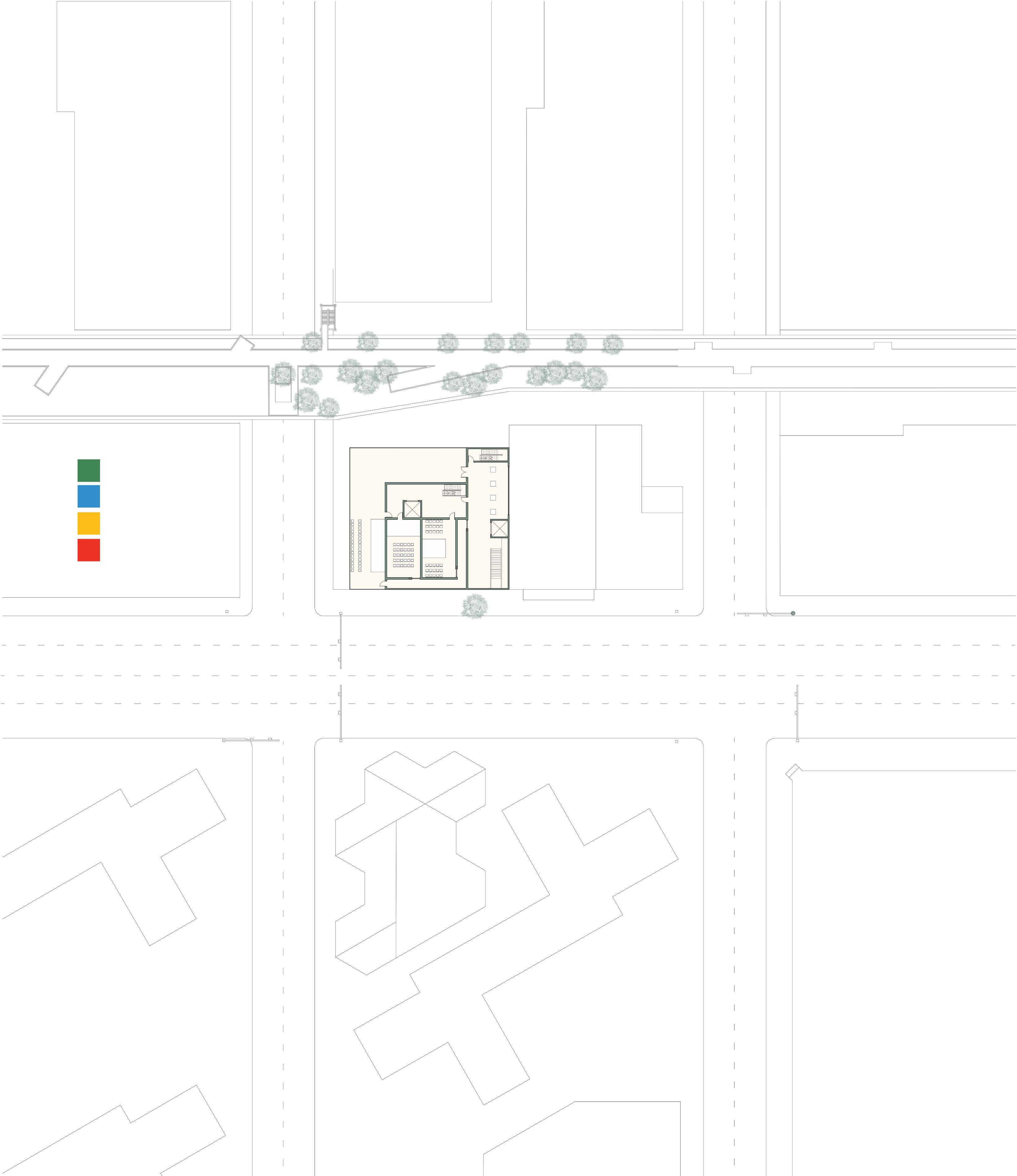 The upper three floors are used by the staff and actors. The fourth floor holds dressing rooms and has easy access to the green room that connects to the theaters below. The technical room is also located in this space to give the staff the best views to help run the shows. The fifth floor holds the administrative spaces and a final, private exhibition space. This is a private floor, meaning the exhibitions hosted here would be an invite-only, post-show gathering space for the actors and crew, their friends, and family. The sixth floor is designated for rehearsal space. These spaces similarly reflect the size and height of the main theater spaces, allowing the actors to have a space to put together their performances. There are also smaller practice rooms that can be privately used to practice their parts on their own.