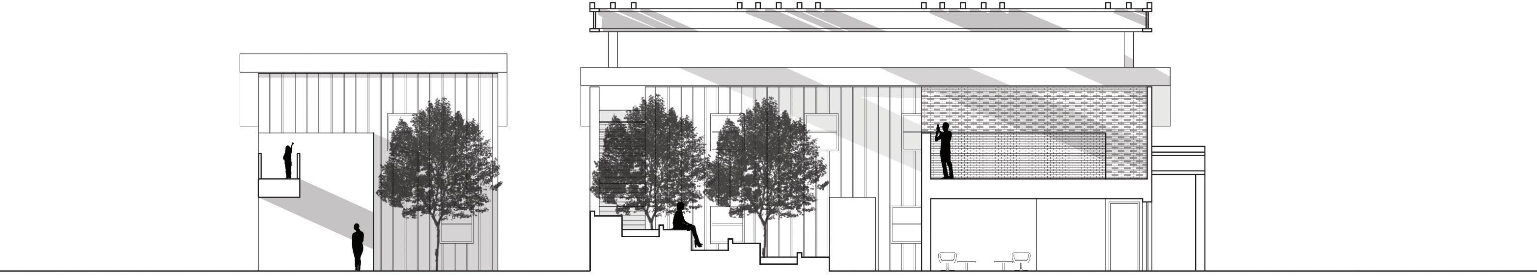 The exterior courtyard is separated from the interior exhibitions by glazing walls. It is accessible through garage doors that are built into the glazing system. This allows for easy transportation of the pieces in the exhibition to the courtyard. The garage doors would ideally stay open on nice days to connect the interior and exterior physically and visibly.