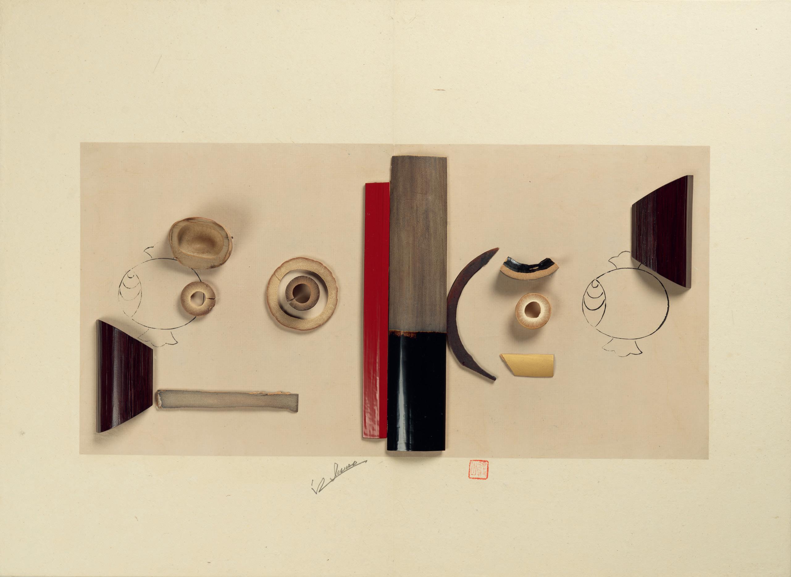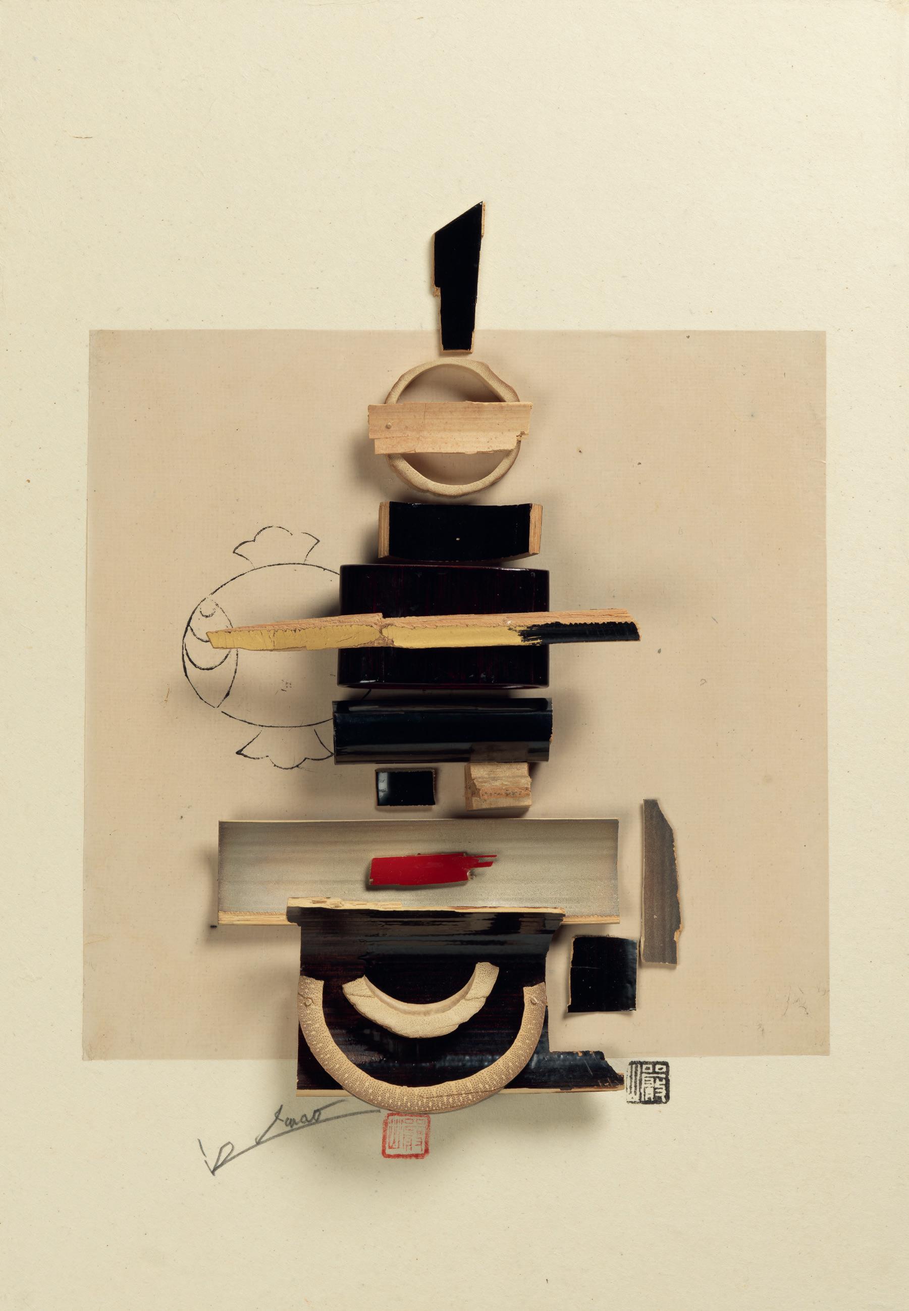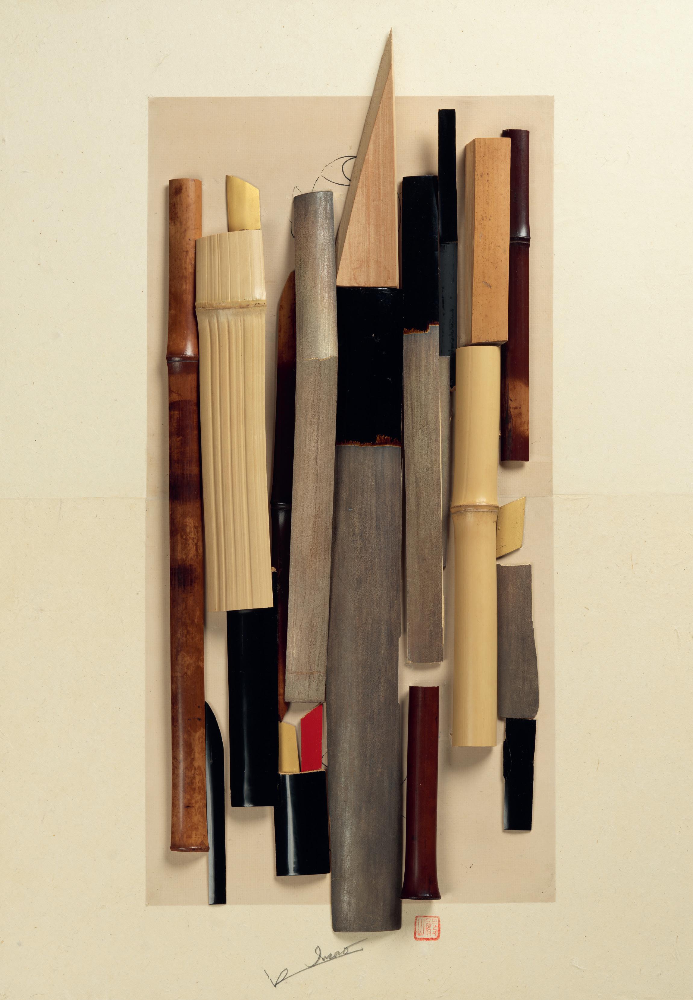 Ikeda’s 2023 solo exhibition Fragments of Thought brought together pieces of bamboo that had been split with a hatchet, shaved down, lacquered and smashed with a wooden mallet — fragments that had fallen away during previous creative processes, which Ikeda had kept close at hand as if cherishing them. They may have been preserved as the remaining parts of the consciousness that produced his creations. Without focusing on concepts of form or practicality, the materials were composed by bringing together an awareness of existence, with ‘fragments’ remaining just as they had been formed. Rather than being mere remnants of creation, Ikeda likely recognized a consciousness of expression that again testified to a new ‘the life of bamboo, the spirit of urushi ’. He mounted these onto flat surfaces of glossy ganpi-shi – traditional Japanese paper previously utilized in the gold leaf beating process – which he had kept for thirty years, producing them as mixed media compositions.