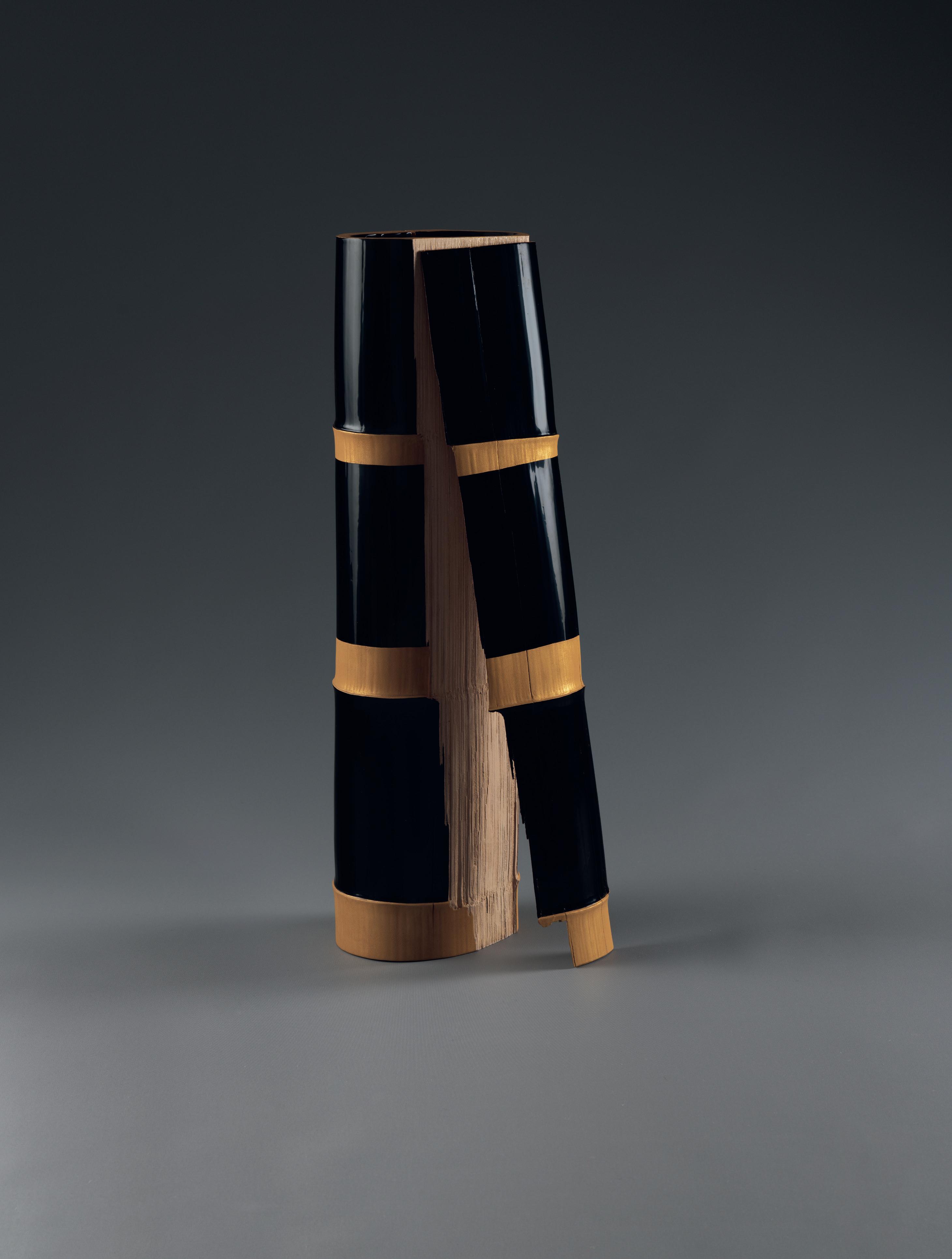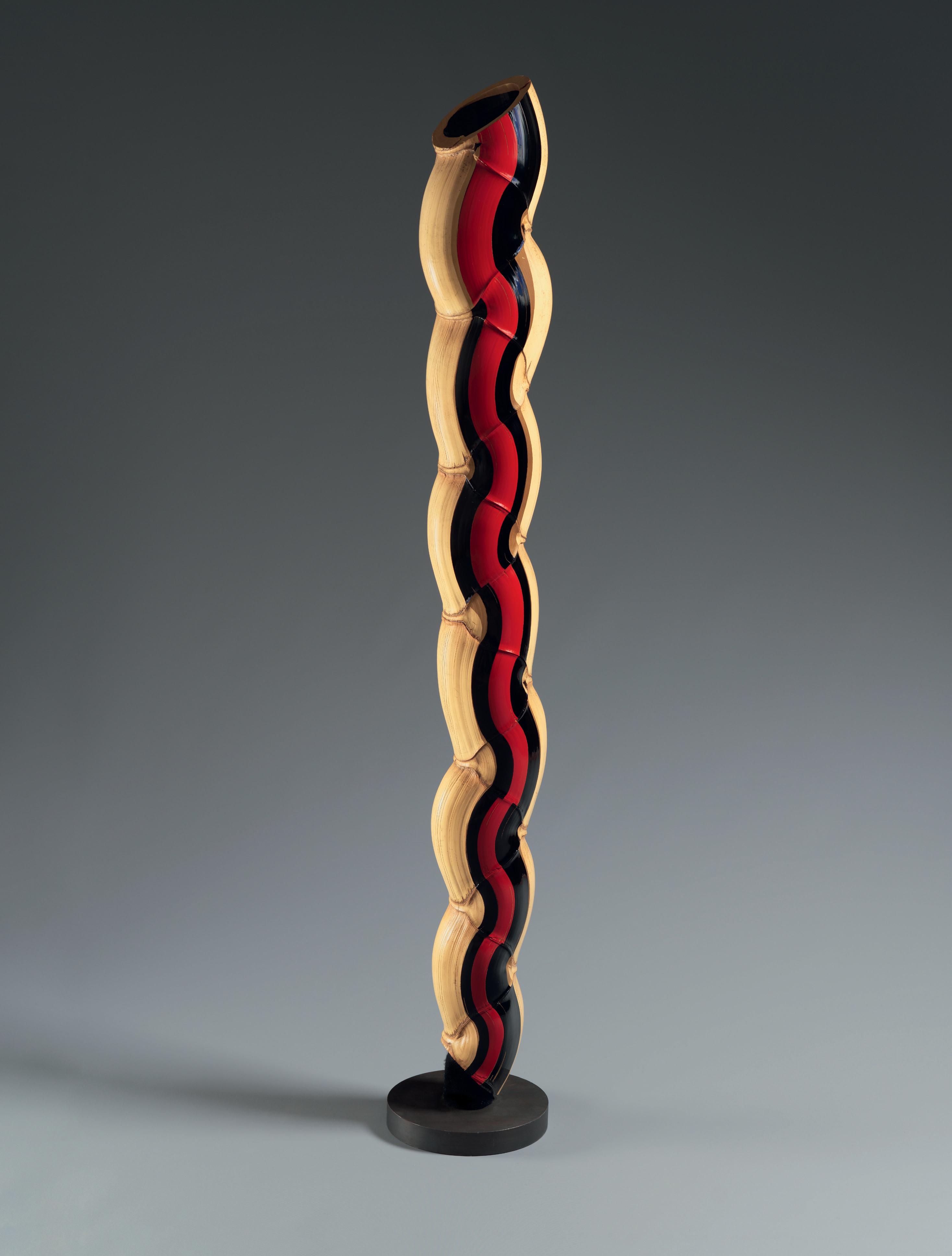 Mr Ikeda had a formal training in bamboo and lacquer craftsmanship but soon used his skills to take bamboo and lacquer into an original art form emphasizing the spirit of the materials. Bamboo, an easily identified and ubiquitous plant, is known for strength, flexibility and its upright form. However, it is by splitting or shearing and lacquering a bamboo section that Mr Ikeda is able to explore and reveal its inner spirit.