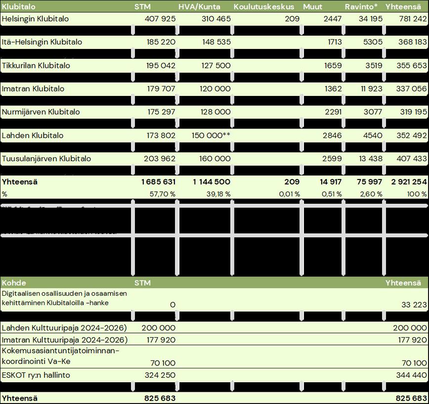 Yhdistyksen Klubitalojen päärahoittajia olivat STM/STEA ja Klubitalojen osalta kunkin talon sijainnin mukainen hyvinvointialue ja/tai kunta. Hallinnon, Kulttuuripajojen ja kokemusasiantuntijatoiminnan koordinoinnin rahoitukset tulivat kokonaan STM/STEAlta.